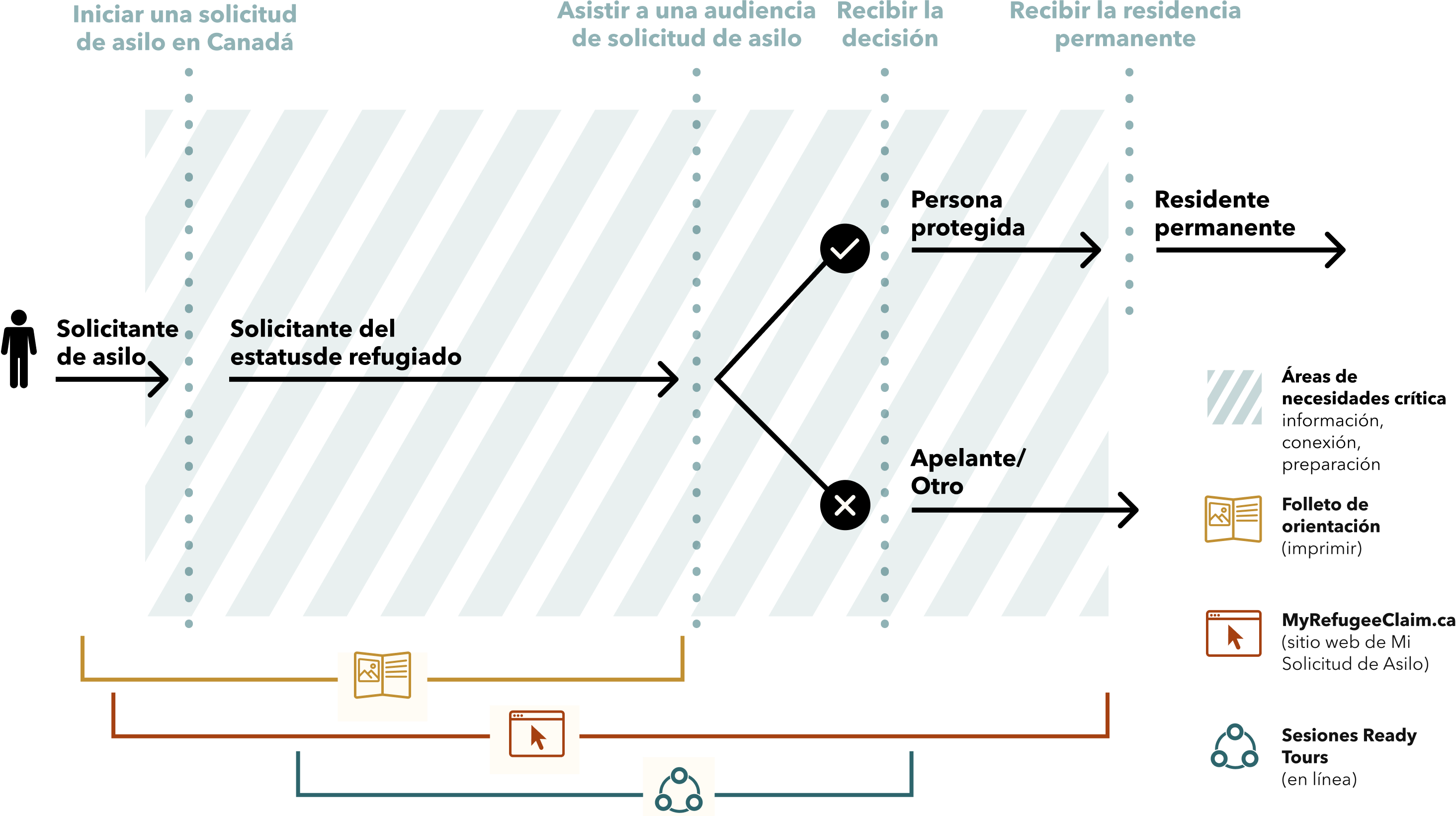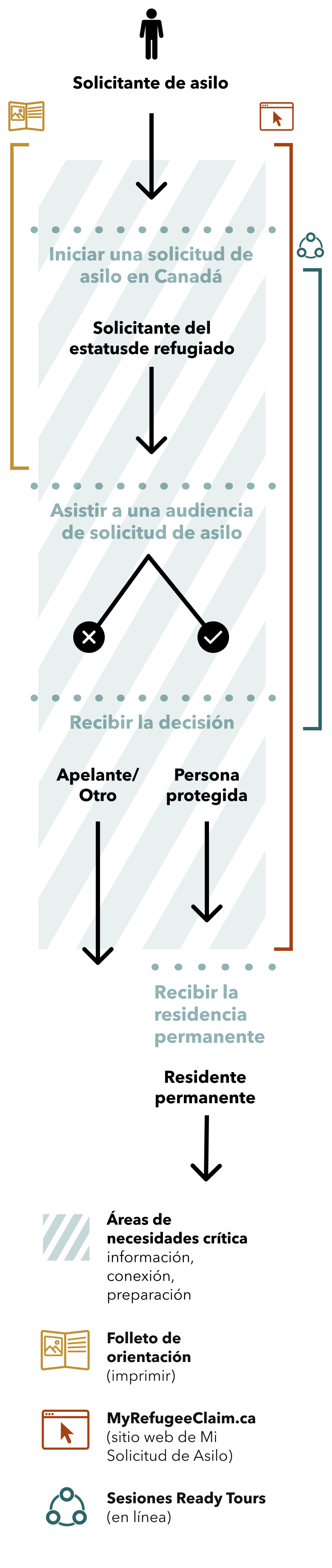 Si es usted solicitante de asilo en Canadá, la Guía de orientación, MyRefugeeClaim.ca y las Sesiones Informativas («Ready Tours») están diseñadas para usted. Le ayudarán a informarse, conectarse y prepararse. Sin embargo, no sustituyen a un buen asesoramiento jurídico.